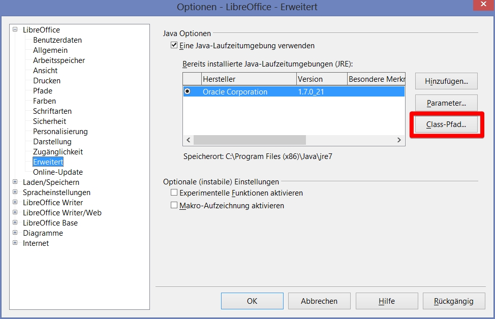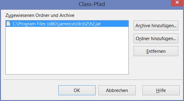 Die Bibliothek h2.jar mit dem Datenbank-Treiber ist in den LibreOffice-Classpath aufzunehmen. Dazu irgendein LibreOffice-Modul (z. B. Writer) öffnen. Unter Extras>Optionen>LibreOffice>Erweitert>Class Pfad den Pfad zur h2.jar auswählen (Archiv hinzufügen). Im Normalfall ist die Bibliothek im Jameica-Verzeichnis im Lib-Verzeichnis vorhanden.