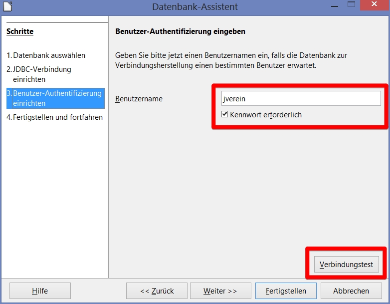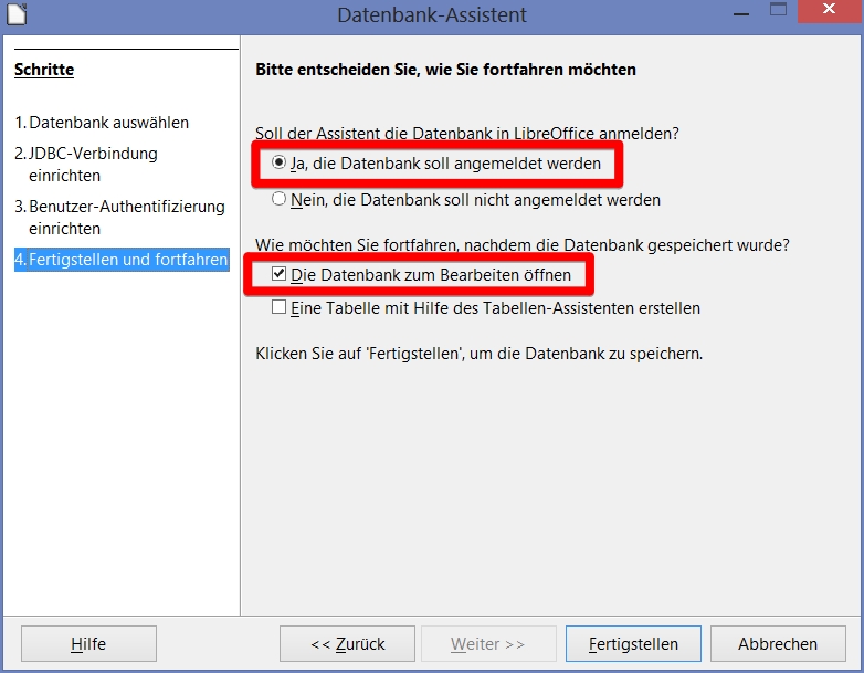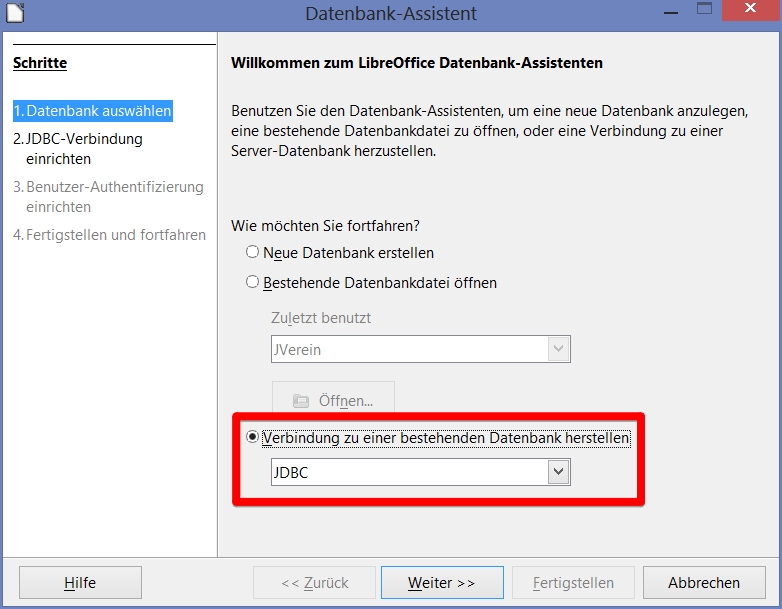 Im Datenbankassistenten den Punkt "Verbindung zu einer bestehenden Datenbank herstellen" auswählen. Im dazugehörigen Dropdown-Menü die Standardeinstellung "JDBC" übernehmen.