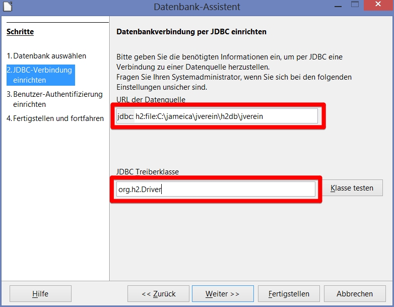 Unter JDBC-Treiberklasse muss der Datenbanktreiber eingetragen werden: org.h2.Driver