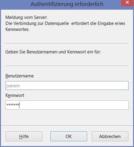 Anschließend öffnet sich LibreOffice Base. Wenn alles geklappt hat fragt Base nun nach Benutzernamen und Passwort für die Datenbank. Hier erneut die oben angegebenen Daten eingeben.