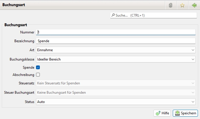 Status: Aktiv bedeutet, dass der Eintrag in Auswahlmenüs zur Eingabe der Buchungsart angezeigt wird. Deaktiviert bedeutet, das die Buchungsart nicht mehr angeboten wird. Das kann Sinn machen wenn man die Buchungsart nicht mehr braucht aber noch alte Buchungen existieren denen sie zugeordnet sind. Bei Auto wird eine Buchungsklasse automatisch ausgeblendet wenn sie mehrere Monate nicht mehr verwendet wurde. Die Anzahl der Monate lässt sich unter Administration->Einstellungen->Buchführung konfigurieren.