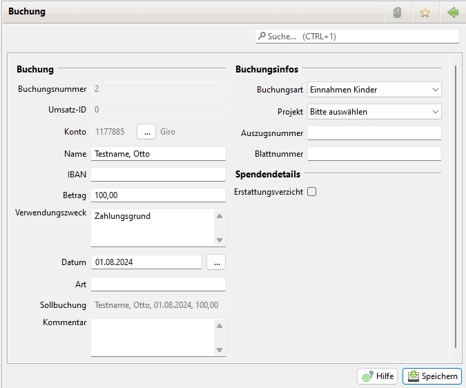 Auf der zweiten Karte kann alternativ in einem Schritt automatisch zuerst eine (neue) Sollbuchung erzeugt werden und dieser dann sogleich die Istbuchung zugeordnet werden. So können z.B. Spenden bequem bei einem Mitglied oder Nicht-Mitglied verbucht werden.