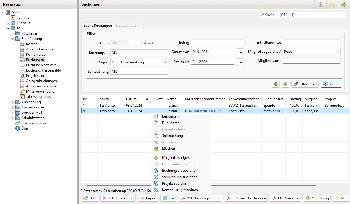Mit einem Doppelklick auf eine Buchung wird die Detailansicht zur Bearbeitung geöffnet. Mit einem rechten Mausklick öffnet sich ein Kontextmenü. Damit können Buchungen bearbeitet werden und bestehende Buchungen gelöscht werden. Der Export der Daten ins PDF oder CSV Format wird durch einen Klick auf PDF/CSV angestoßen.
