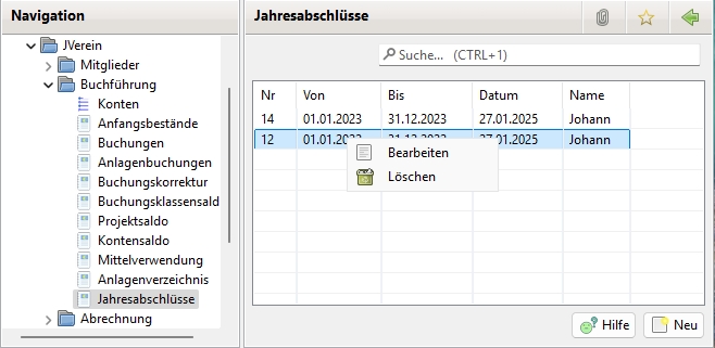 Über das Kontextmenü kann jeweils nur der neuste Jahresabschluss gelöscht werden.