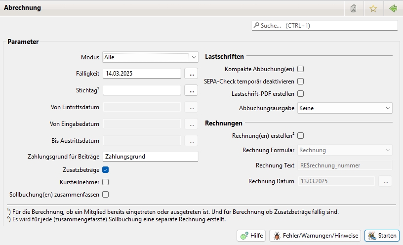 Tipp zum Workflow: Zuerst noch neue Mitglieder anlegen. Danach die Abrechnung machen und dabei als Datum für Von Eintrittsdatum/Eingabedatum den Tag nach der letzten Abrechnung für eingetretene Mitglieder (ersatzweise den Tag nach der letzten Abrechnung für Alle) verwenden. Nach der Abrechnung am selben Tag keine neuen Mitglieder mehr erfassen, die würden bei diesem Workflow sonst nicht mehr abgerechnet.