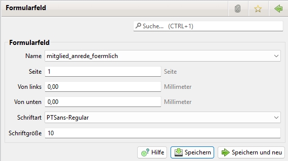 Bei den Formularfelder Buttons klickt Ihr auf "Neu", um das erste einzufügende Datenfeld auszuwählen und zu positionieren: (Die spätere Reihenfolge Eurer Datenfelder ist egal! Ihr könnt auch erst hinten anfangen)