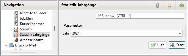 Mit der Statistik Jahrgänge werden die Mitglieder nach Geburtsjahrgängen gezählt. Dabei gibt es eine Unterscheidung nach Geschlecht. Die Ausgabe ist im PDF- und im CSV-Format möglich.