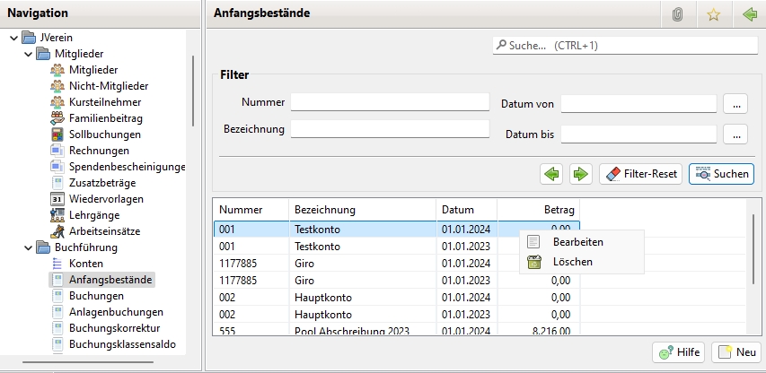 Über den Button Neu werden neue Anfangsbestände aufgenommen. Mit einem Doppelklick auf einen Anfangsbestand kann der Bestand bearbeitet werden. Ein Rechtsklick auf einen Anfangsbestand öffnet ein Kontextmenü. Damit kann ein Anfangsbestand gelöscht werden.