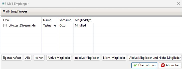 In diesem Fenster sind zunächst alle an- und abgemeldeten Mitglieder sowie alle weiteren Adressen aufgelistet, bei denen eine E-Mail-Adresse hinterlegt ist. Mail-Empfänger können nun einzeln durch Setzen des Häkchens vor der E-Mail-Adresse ausgewählt werden. Ferner stehen (ab Version 2.8.4) folgende Filter bzw. Selektoren zur Verfügung: