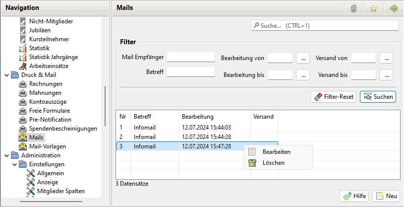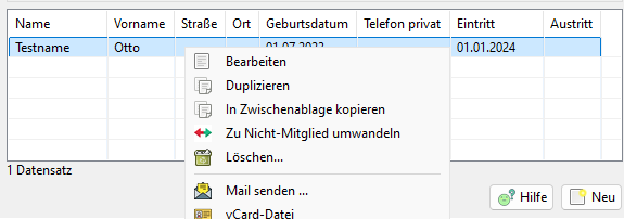 Der Mailversand kann auch über einen Rechtsklick auf ein Mitglied ausgelöst werden: