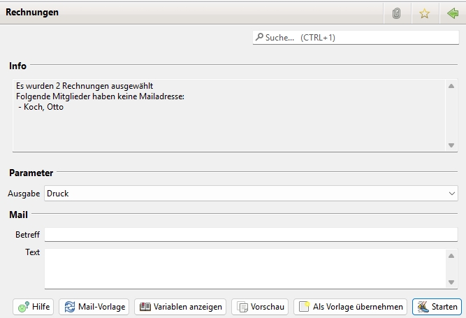 Im Info Feld wird angezeigt wie viele Rechnungen selektiert wurden und ob zugehörige Mitglieder keine Mailadresse haben. Haben sie keine Mail Adresse werden sie beim Versand per Mail ignoriert.