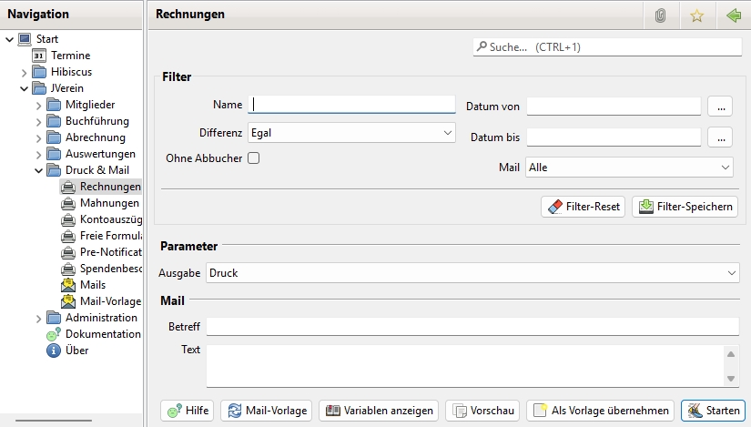 Die Rechnungen können für den Druck in ein PDF-Dokument ausgegeben werden oder per Mail an die Mitglieder versandt werden.