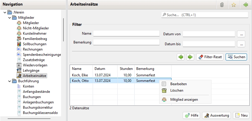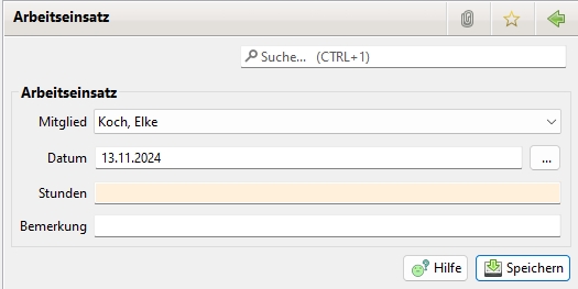 Danach kann hier beim Erfassen von Arbeitsstunden im Feld Stunden auch ein negativer Wert eingetragen und damit die Sollstunden des Mitglieds erhöht werden. Damit kann man Dienstleistungen des Vereins, die mit Arbeitsstunden gegengerechnet werden können, einfach erfassen und abrechnen.