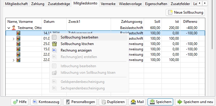 Rechnung anzeigen: Dieser Menüpunkt ist aktiv wenn eine Rechnung für die Sollbuchung existiert. Diese wird dann angezeigt