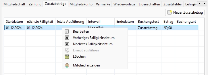 Vorheriges Fälligkeitsdatum: Das Fälligkeitsdatum um ein Intervall zurücksetzen, dadurch wird der Zusatzbetrag ein weiteres mal abgerechnet. (nur bei Zusatzbeträgen mit Wiederholung)