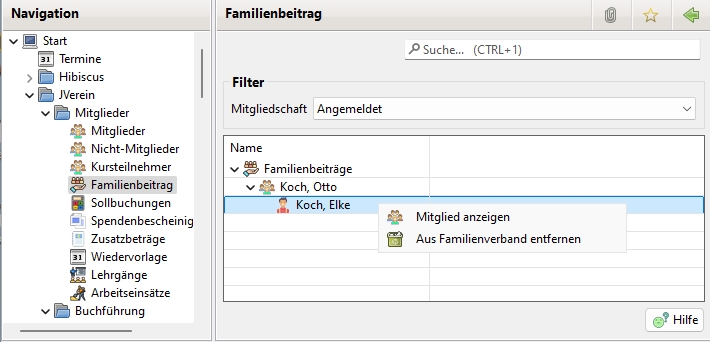 Nach Einrichten der ersten passenden Beitragsgruppe sollte JVerein neu gestartet werden, damit der Menüpunkt "Familienbeitrag" zur Verfügung steht.