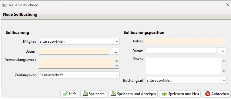 Speichern und Neu: Speichert die Sollbuchung und erlaubt es eine weitere Sollbuchung zu erzeugen. Außer Mitglied und Zahler bleiben die Eingaben erhalten