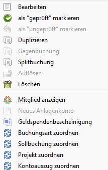 Durch einen Rechtsklick auf eine Buchung öffnet sich ein Kontextmenü mit mehreren Optionen: