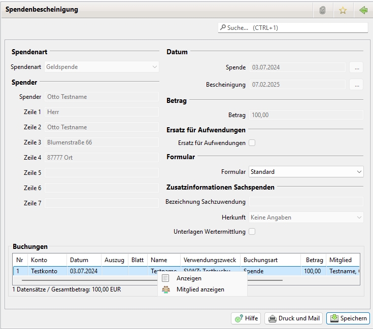In der Liste der Buchungen. Mit einem Klick auf eine Buchung mit der rechten Maustaste öffnet sich ein Kontextmenü um die Geldspendenbescheinigung zu erstellen. In diesem Fall kann entweder ein Mitglied oder Nicht-Mitglied im Dialog als Spender ausgewählt werden oder auch nur die Adressdaten des Spenders eingegeben werden. Die Buchung bestimmt den Betrag und das Spendendatum.
