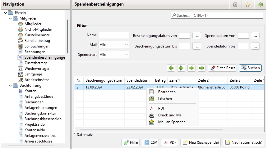 Die Spendenbescheinigung wird manuell ausgestellt und die Daten des Zahlers eingetragen