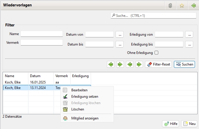 Die Wiedervorlage Termine aller Mitglieder können hier angezeigt und als erledigt gekennzeichnet werden.