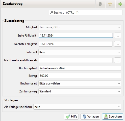 Bei der Erfassung von Zusatzbeträgen kann angegeben werden, ob der Zusatzbetrag als Vorlage gespeichert werden soll. Dabei kann angegeben werden, ob Datumsangaben mitgespeichert werden sollen.