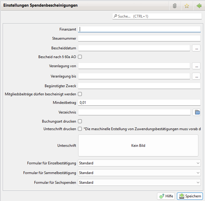 Hier können die Werte zur Erstellung von Spendenbescheinigungen eingestellt werden.