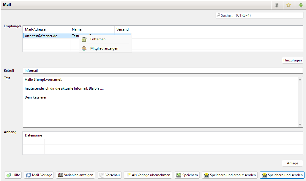 Im Betreff und im Text können Variable eingefügt werden, die beim Mailversand mit den konkreten Daten gefüllt werden. Mit Rechtsklick auf den Empfänger oder über den untenstehenden Button können die verfügbaren Variablen und ihre Belegung angezeigt werden.