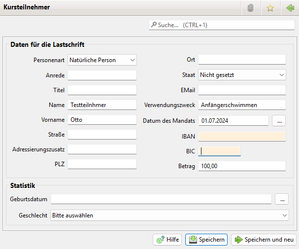 Mit dem Button Neu kann ein neuer Kursteilnehmer eingerichtet werden.