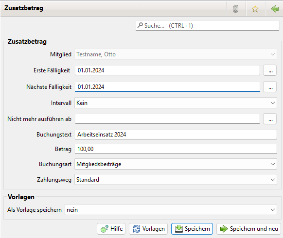 Bei der Erfassung von Zusatzbeträgen kann angegeben werden, ob der Zusatzbetrag als Vorlage gespeichert werden soll. Dabei kann angegeben werden, ob Datumsangaben mitgespeichert werden sollen.