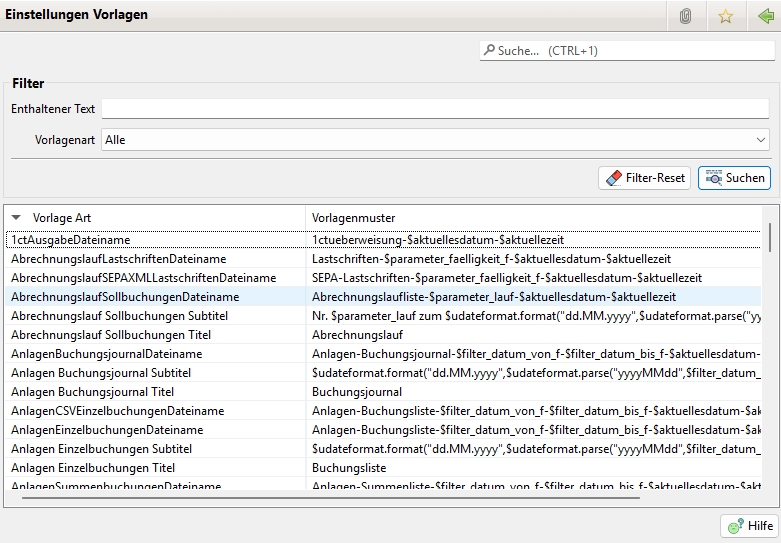 Für die Generierung von Dateinamen, Report Titel und Subtitel existieren Vorlagenmuster die vom Benutzer editiert werden können.
