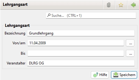 Die Bezeichnung und Von/am des Lehrgangs muss ausgefüllt werden. Die restlichen Daten können leer gelassen werden. Diese Daten sind dann einzugeben, wenn beim Mitglied der Lehrgang angelegt wird.