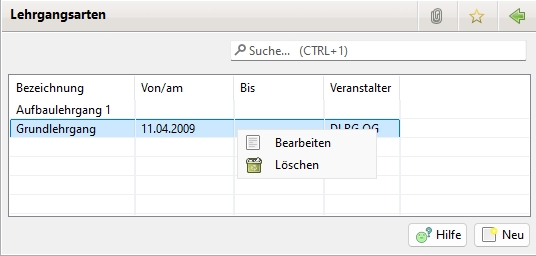 Durch einen Doppelklick wird die Bearbeitung einer Lehrgangsart eingeleitet.