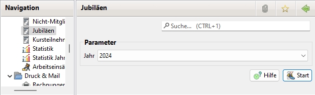 Die Mitglieder, die ein Mitgliedschaft- oder Alters-Jubiläum begehen, können ausgewertet werden. Unter Administration->Einstellungen->Statistik werden die Jubeljahre eingetragen. Bei der Auswertung kann aus einer Dropdown-Box das Jahr ausgewählt werden. Zur Verfügung stehen das aktuelle Jahr, das Vorjahr und 2 Folgejahre. Die Ausgabe erfolgt im PDF-Format.