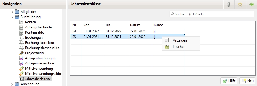 Über das Kontextmenü kann jeweils nur der neuste Jahresabschluss gelöscht werden.