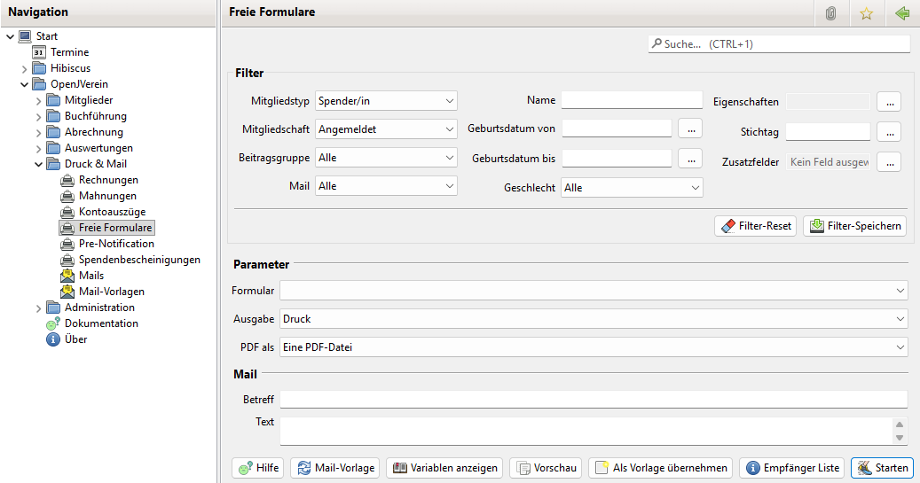 Im Filter Bereich lässt sich einstellen für welche Mitglieder bzw. Nicht-Mitglieder freie Formulare gedruckt oder verschickt werden sollen.