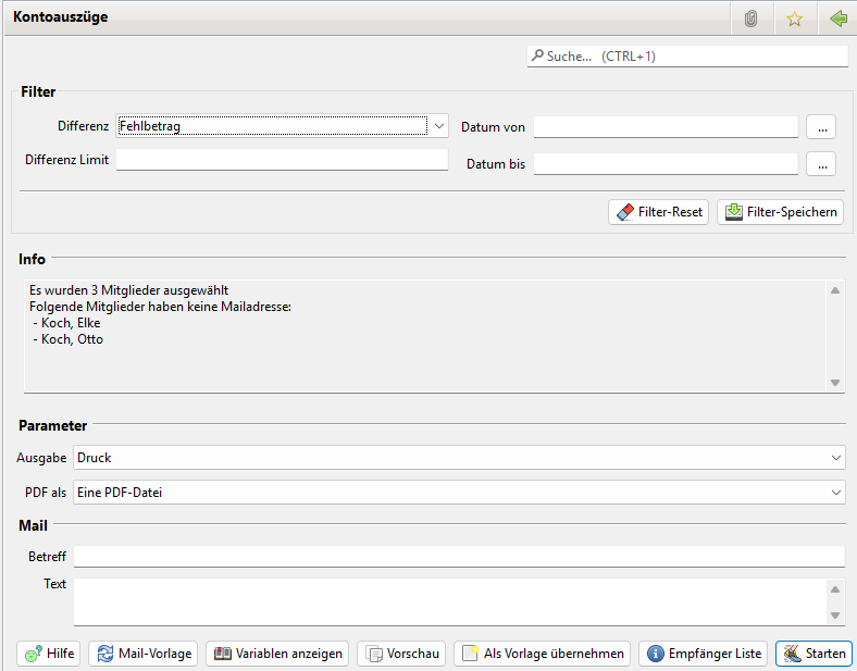 Differenz: Bei "Fehlbetrag" werden nur Kontoauszüge für Mitglieder erstellt wenn ein Fehlbetrag vorliegt und bei "Überzahlung" nur wenn überzahlt wurde. Bei "Egal" wird nicht auf den Betrag geprüft.