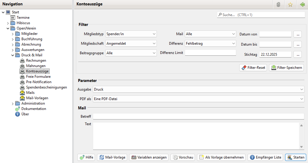 Die Kontoauszüge können für den Druck in ein PDF-Dokument ausgegeben werden oder per Mail an die Mitglieder versandt werden.