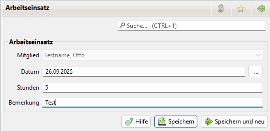 Danach kann hier beim Erfassen von Arbeitsstunden im Feld Stunden auch ein negativer Wert eingetragen und damit die Sollstunden des Mitglieds erhöht werden. Damit kann man Dienstleistungen des Vereins, die mit Arbeitsstunden gegengerechnet werden können, einfach erfassen und abrechnen.