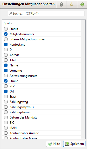Festlegung der Spalten, die in der Mitglieder Tabelle angezeigt werden sollen.