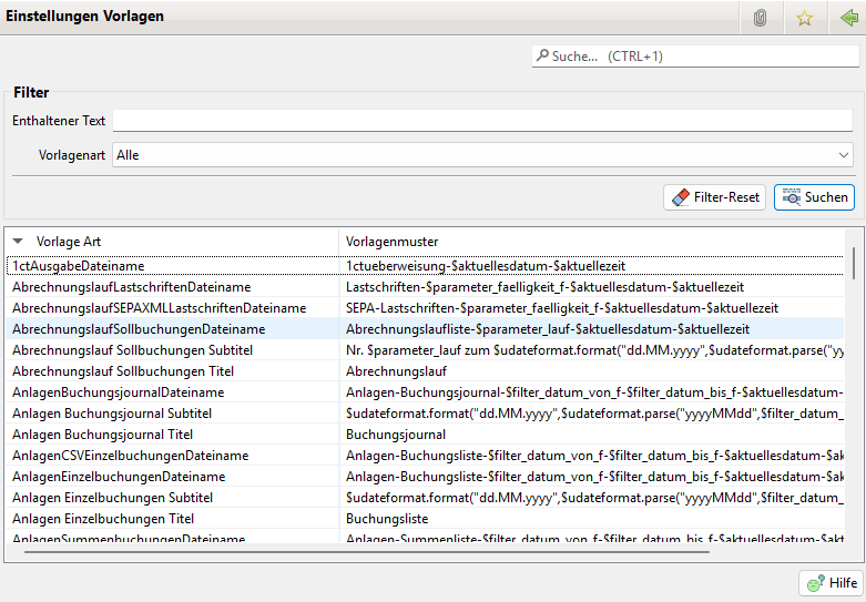 Für die Generierung von Dateinamen, Report Titel und Subtitel existieren Vorlagenmuster die vom Benutzer editiert werden können.