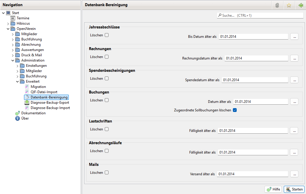 Mit der Funktion Datenbank bereinigen lassen sich Daten in JVerein löschen die älter als ein bestimmtes Datum sind.