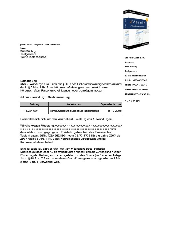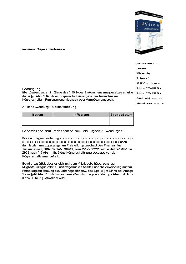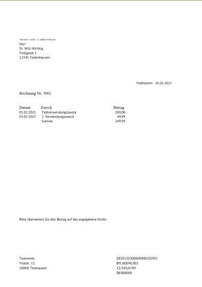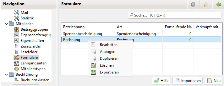 In JVerein werden für Spendenbescheinigungen, Mahnung, Rechnungen, Pre-Notification und diverse Zwecke Freie Formulare hinterlegt.