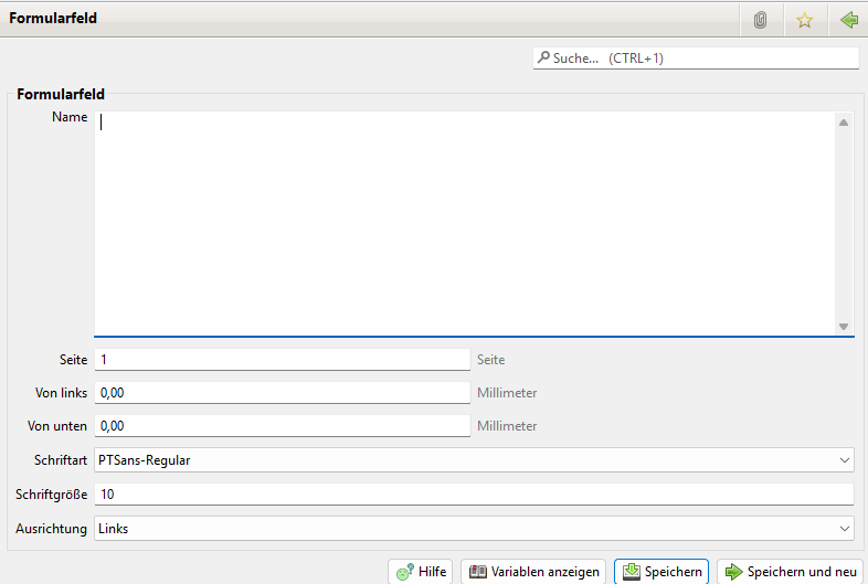 Bei den Formularfelder Buttons klickt Ihr auf "Neu", um das erste einzufügende Datenfeld auszuwählen und zu positionieren: (Die spätere Reihenfolge Eurer Datenfelder ist egal! Ihr könnt auch erst hinten anfangen)