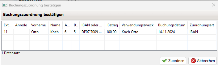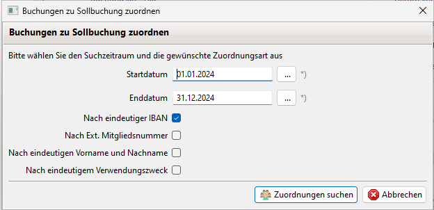 Wurden mehrere Zuordnungsarten auf einmal angegeben (IBAN, Mitgliedsnummer, Vor- und Nachname) wird eine Zuordnung in der genau dieser Reihenfolge versucht.