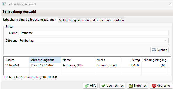 Sollbuchung zuordnen: Es öffnet ein Dialog zur Zuordnung einer Sollbuchung (siehe unten)