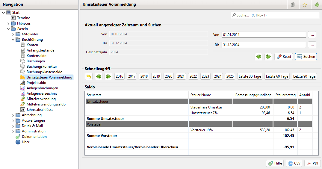 Des Umsatzsteuer Voranmeldung View listet die nach Steuer Name angefallenen Beträge und Steuern für ein Geschäftsjahr oder einen frei wählbaren Zeitraum auf. Zusätzlich werden die steuerfreien Umsätze gelistet.