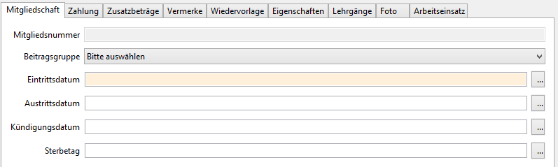Beitragsgruppe ist ein Pflichtfeld. Die Beitragsgruppen können unter Beitragsgruppen für jeden Verein individuell konfiguriert werden. Siehe auch Beitragsmodelle. Beim Austrittsdatum wird das Datum des satzungsgemäßen Austritts (z. B. der 31.12. des jeweiligen Jahres) eingetragen. Unter Kündigung wird das Datum des Eingangs der Kündigung vermerkt.