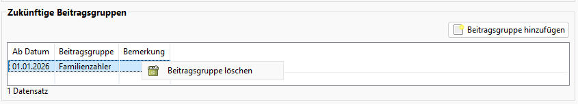 Bei Mitgliedern von Beitragsgruppen der Beitragsart Familienangehöriger können Sie keine zukünftigen Beitragsgruppen hinterlegen, weil hier u.U. Zahlungsdaten fehlen.