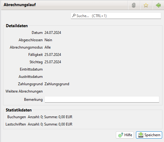 Löschen: Löscht den Abrechnungslauf. Dies löscht auch alle vom Abrechnungslauf generierten Sollbuchungen, Buchungen und Lastschriften